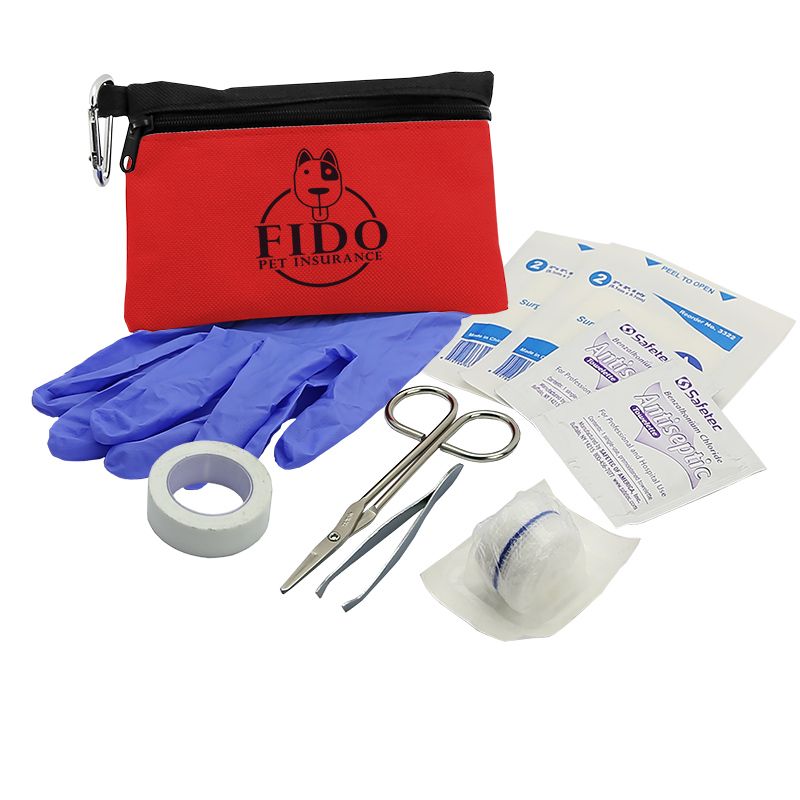Be prepared for a pet emergency with our pet first aid kit! Includes: Two-tone 600D polyester zipper with 50mm carabiner clip, conform gauze roll, scissors, tweezers, gloves, first-aid tape, two gauze pads, and two antiseptic towelettes. 4" H x 6" W